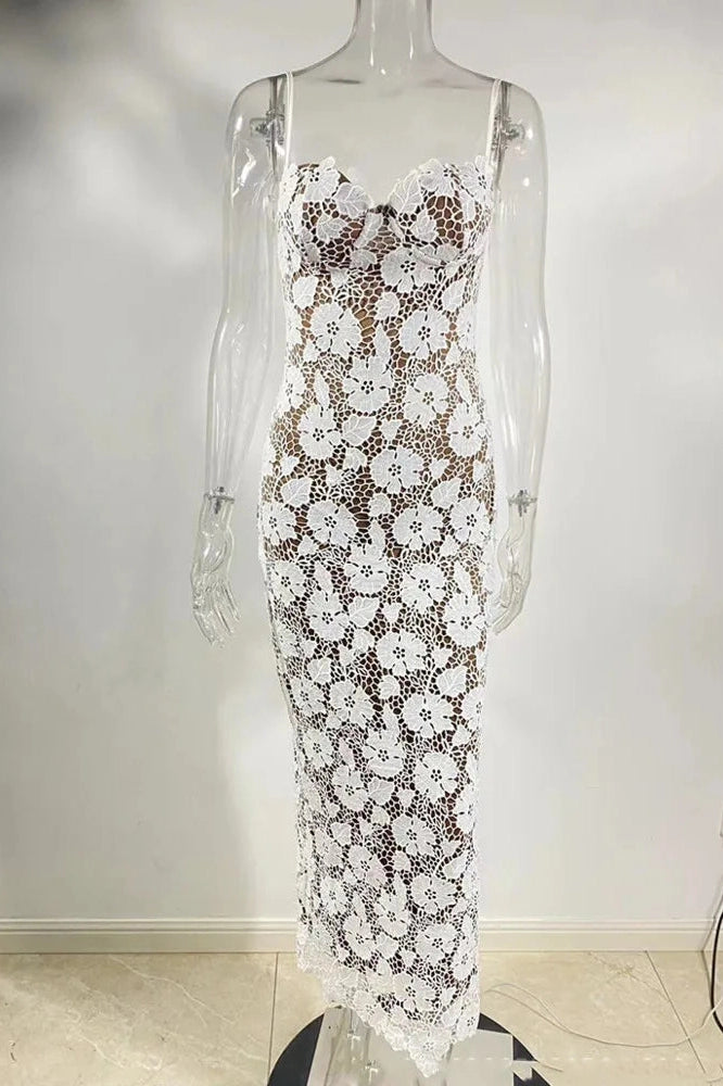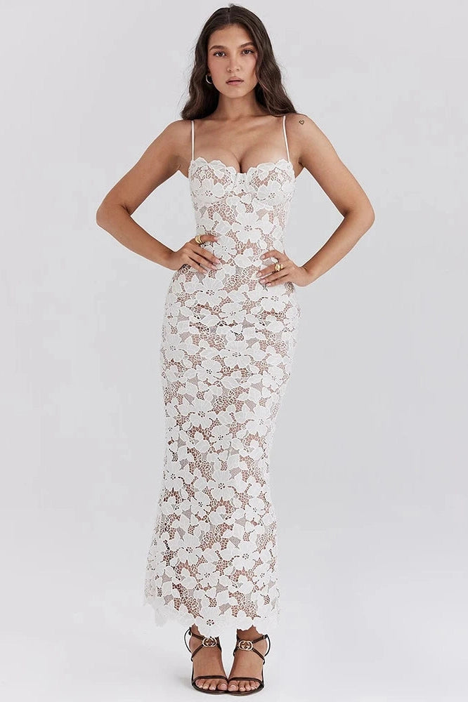 Elegant maxi dress featuring delicate floral embroidery, spaghetti straps, and a sleeveless design. Perfect for parties, summer outings, and special occasions with a feminine, figure-flattering silhouette.