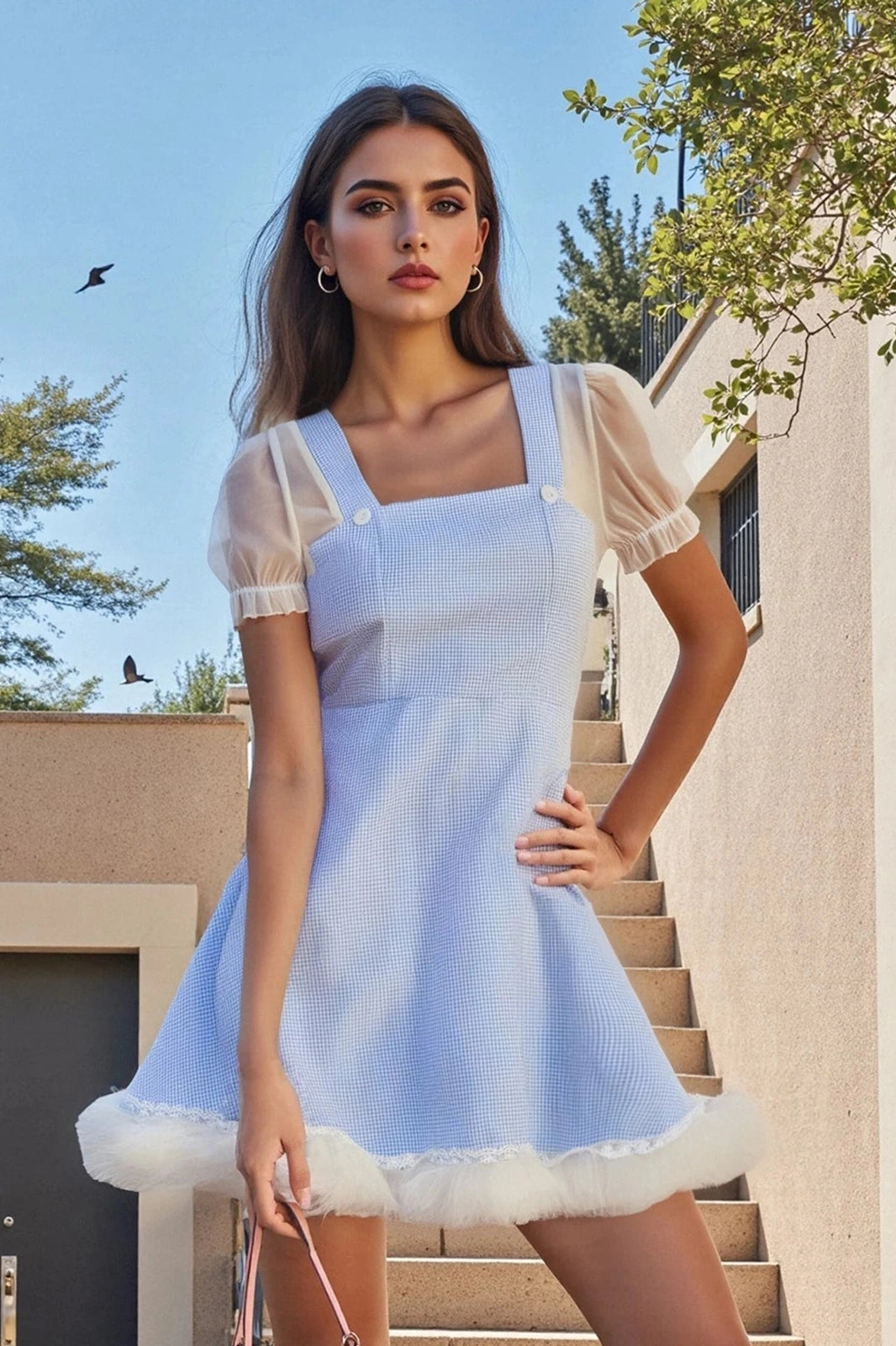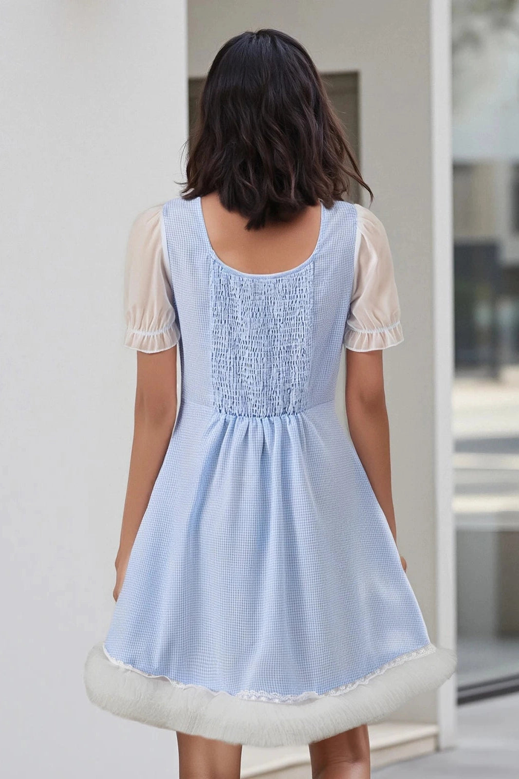 Trendy A-line mini dress with a plaid pattern, square neckline, and short sleeves. Perfect for casual outings, parties, and summer events with a stylish and flattering fit.